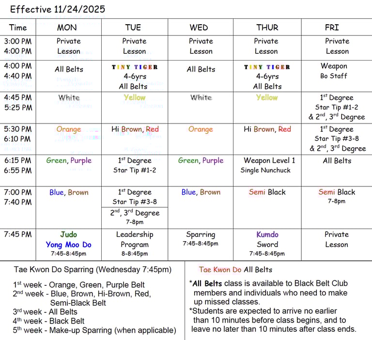 Private lessons are taught by either Master Park or Master Andrew. Students can choose the length of time and the requirements they want to focus on for their lesson. This is a great option for students who need extra help or want to review before a belt test.
